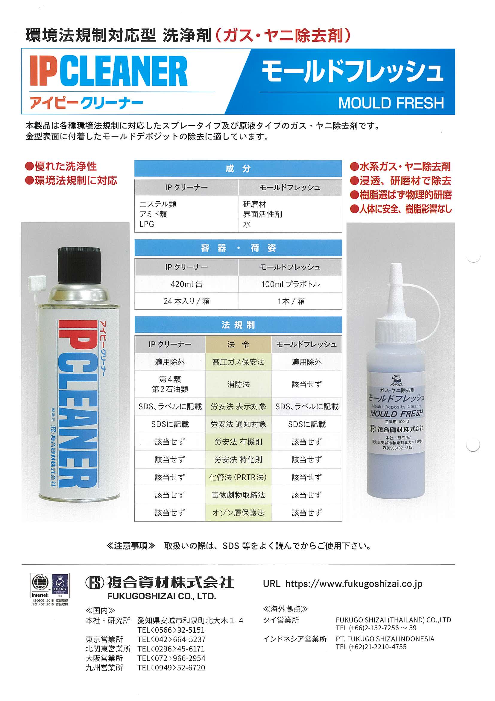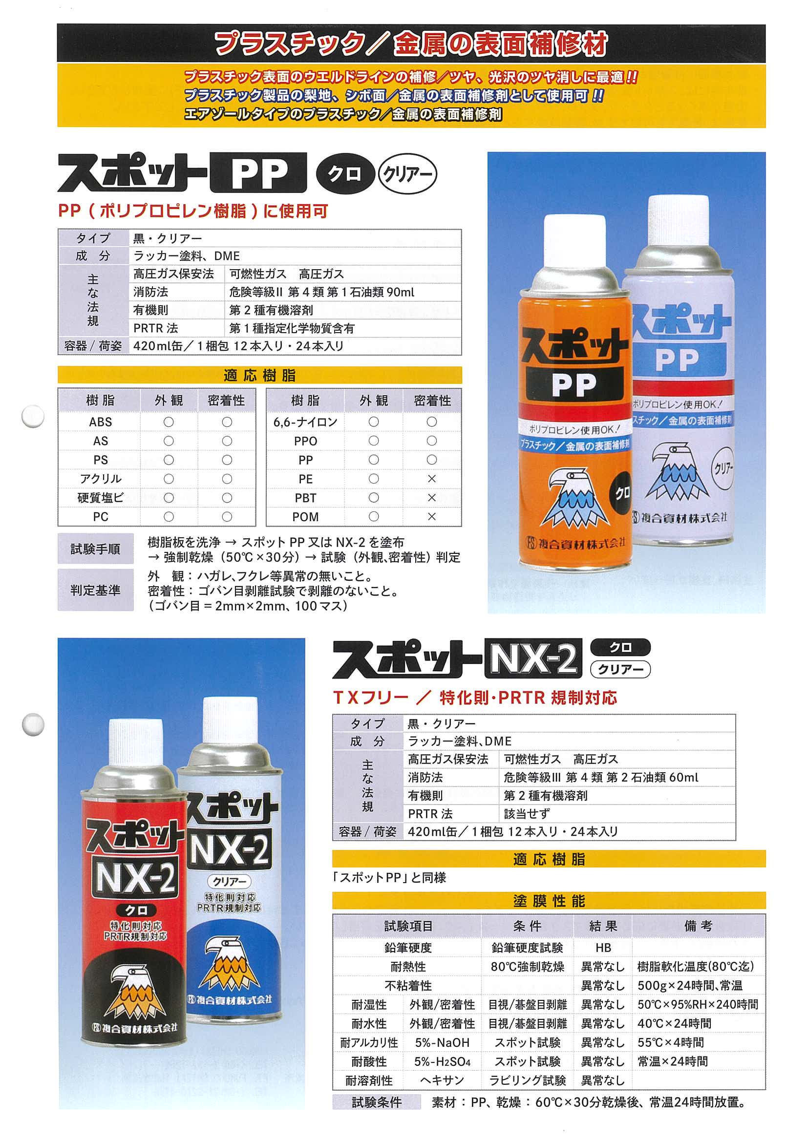 製品カタログ 以下の製品カタログをご用意しております。画像のリンク先よりダウロードください。(PDF形式) 離型剤総合防錆剤総合洗浄剤総合 潤滑剤総合法規制対応強力洗浄剤法規制対応ガスヤニ除去剤 スポットPP、NX-2エレカット、エレカットLスパガード FSトーチピーラックNXPROクリーナー
